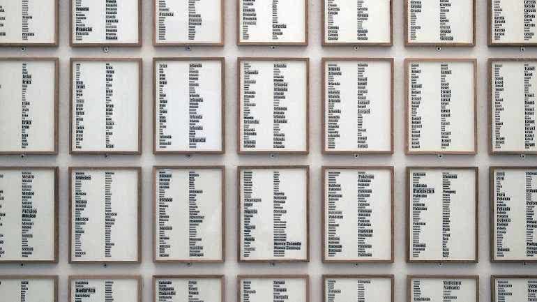 Ignasi Aballí Mapamundi 2010, 2011. Collage sobre papel, 30 x 21 cm c/u (110-115 ejemplares aprox.). Colección del artista.