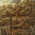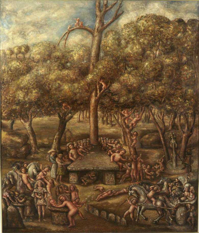 Por vez primera, una selección de sus obras más destacadas se exhibe junto a piezas de otros artistas que José Otero Abeledo “Laxeiro” (Donramiro – Lalín, Pontevedra, 23 febrero 1908 – Vigo, 21 julio 1996) miraba con atención o que plantean referencias para un diálogo visual. Como ejemplos de lo primero, las pinturas de Ignacio Zuloaga o Jesús Corredora, que Laxeiro vio en La Habana; las de los años treinta de Arturo Souto, Manuel Colmeiro o Carlos Maside; obras de diferentes épocas de Castelao, Asorey, Maruja Mallo, Luis Seoane o Torres García. Entre las «devociones», Gutiérrez Solana, Vázquez Díaz, Benjamín Palencia, Miró o los más tardíos Antonio Saura, Rafael Canogar o Washington Barcala. Como notas atemporales, Rembrandt y Goya, homenajeados muchas veces por el gallego, y presentes con obra gráfica.