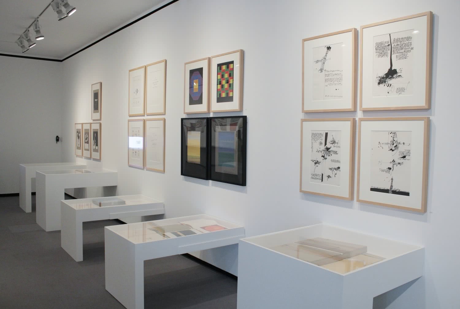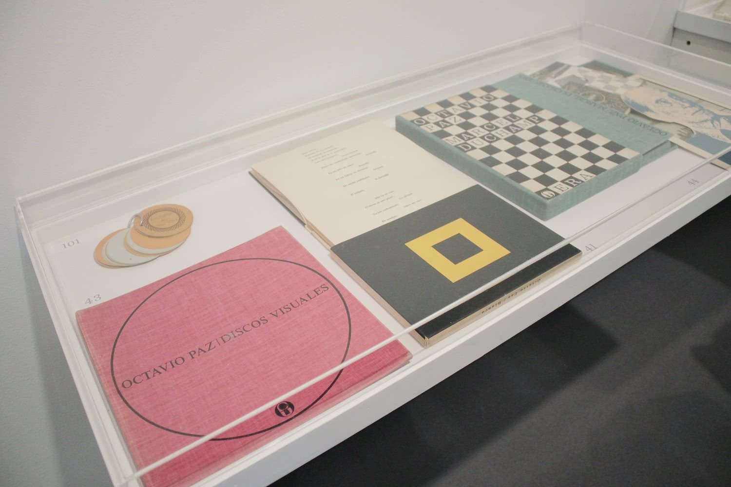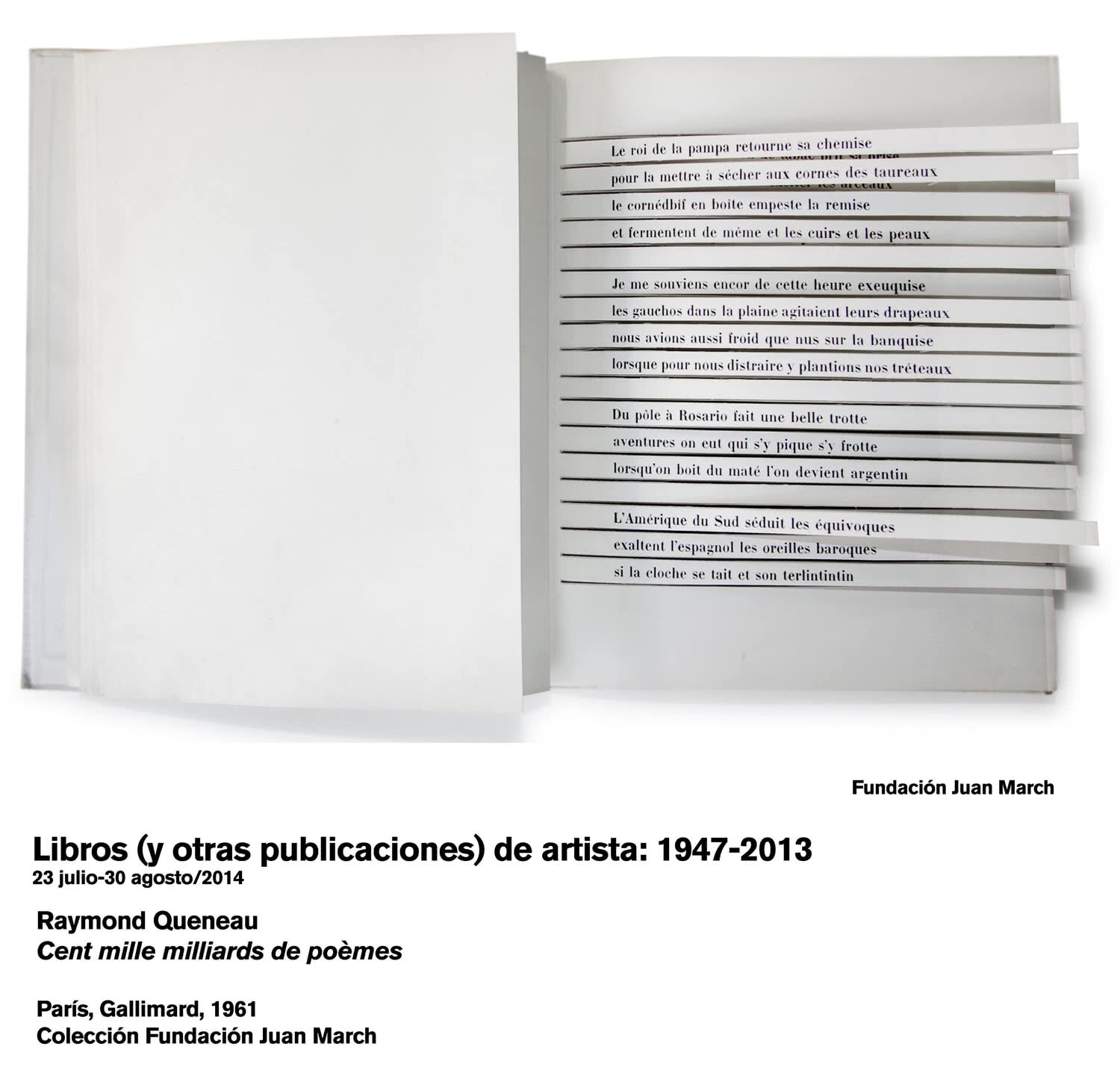 Hay también libros-objeto como los Discos Visuales (México, Era, 1968), Vrindaban (México, Imprenta Madero, 1965), de Octavio Paz, o el célebre Cent mille milliards de poèmes, de Raymond Queneau (París, Gallimard, 1961). Y también ediciones de artista, como el Libro de horas de Fernando Zóbel (Manila, 1965) o Ardicia, de Pablo Palazuelo (París, RLD éditeur, 1978), y experimentos de arte postal como la caja con cien postales de artistas WC4 Box’83 (Nueva York, 1983).