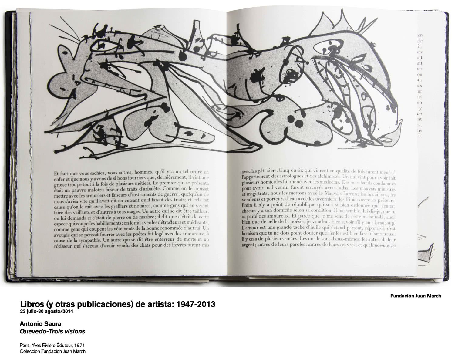 Libros (y otras publicaciones) de artista: 1947-2013, a pesar de ser muy heterodaxa, contiene un hilo que la atraviesa. «En ella hay una obra que hemos considerado inicial, que aunque está escrita en el año 12 fue publicada en el 47. Es un estudio sobre el cubismo, Du Cubisme, de Albert Gleizes y Jean Metzinger. Es un texto ilustrado y contiene grabados de diferentes artistas como Duchamp, Braque, Picabia… Llegamos al 2013 con una pequeña carpeta titulada Pan con lágrimas, que es el resultado de la visión de Eduardo Arroyo a partir de un texto del escritor alemán Kurt Tucholsky», resumen Manuel Fontán, director de exposiciones de la Juan March.
