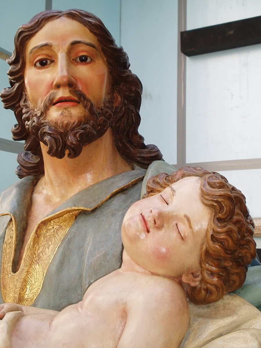 En María, Virgen y Madre se agrupa varias advocaciones marianas en obras esculpidas por Luján, además de dos pinturas de Juan de Miranda dedicadas a la Inmaculada Concepción y a la Asunción. El recorrido expositivo continúa con Escenografía del dolor, que reúne el conjunto más significativo del quehacer como imaginero del maestro Pérez. Junto a las obras pasionarias de Luján se exhiben seis cuadros de un nuevo Vía Crucis del pintor Juan de Miranda localizado en Gran Canaria. Y con el enunciado Un renovado mundo de Santos se muestran diversas tallas hagiográficas, de gran plasticidad y expresividad, junto a una pintura sobre tabla de Juan de Miranda.