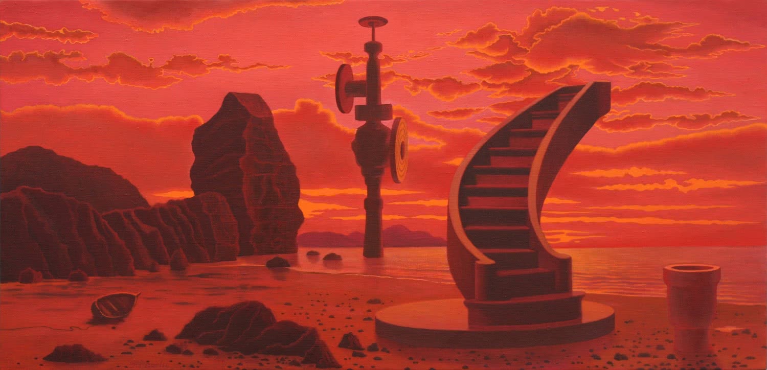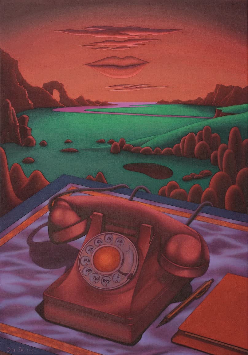 La obra de Dis Berlin se caracteriza por la esmerada técnica con la que está ejecutada y por ese mundo propio tan particular que representa. La selección de su trabajo está compuesta en su mayor parte por paisajes e interiores poblados por objetos y figuras humanas tratadas casi como objetos. La combinación de estos elementos produce escenas paradójicas cargadas de misterio y de sentido del humor. En estas piezas consigue crear un ambiente metafísico del que emana una quietud y un silencio que invitan a la meditación, nacida deliberadamente como contrapunto a la confusión y vacuidad que él percibe en el mundo actual.