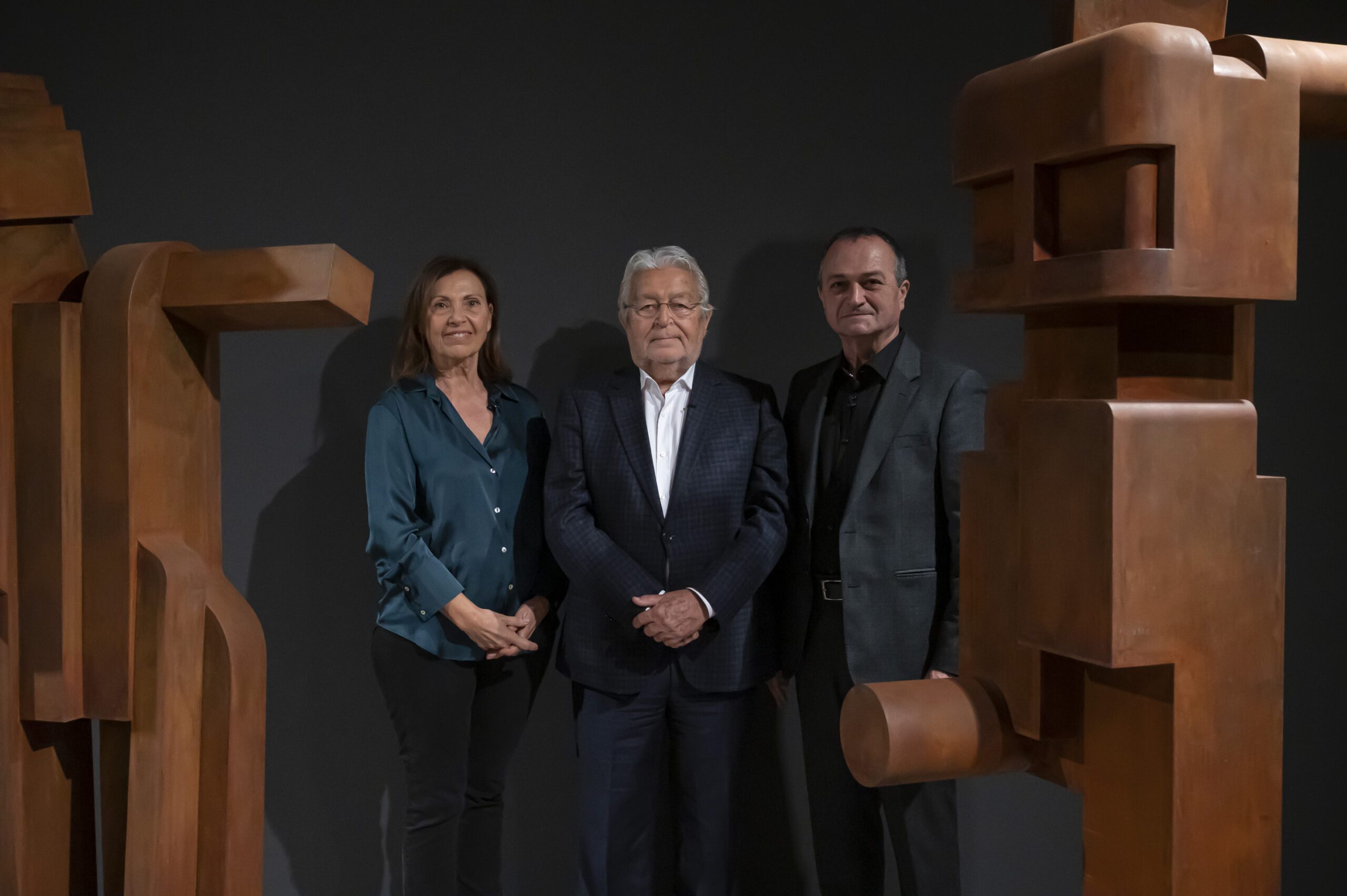 De izquierda a derecha: la escultora Amparo Carbonell, comisaria de la exposición; el presidente de la Fundación Bancaja, Rafael Alcón; y el arquitecto Javier Domínguez, comisario de la muestra.