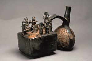 Vasija ceremonial silbadora que representa una escena de una ceremonia de consumo de chicha, danza y culto al ancestro. Chimú, 1100 – 1470 d.C. Cerámica.