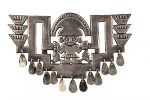 Nariguera que representa a un ancestro divinizado sobre una estructura escalonada. Chimú, 1100 – 1470 d.C. Plata. © Archivo Museo Larco