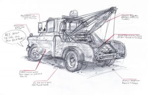 Bob Pauley, Mate (Cars, 2006), reproducción de dibujo a lápiz. © DisneyPixar