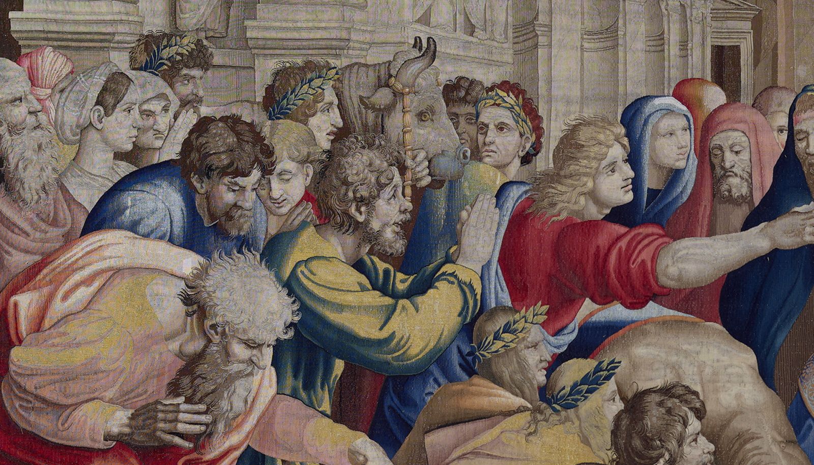 Casi cinco siglos después, Patrimonio Nacional conserva dos de esas réplicas basadas en los cartones originales de Rafael. Una se adquirió durante el reinado de Felipe III (1578-1621) y la segunda y más antigua es la de Felipe II, la que protagoniza esta exposición temporal en la Galería Principal del Palacio Real, un espacio acorde con la monumentalidad y estructura arquitectónica de la tapicería del artista de Urbino.