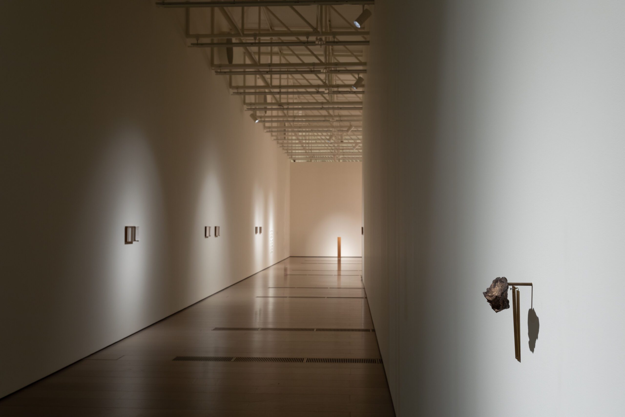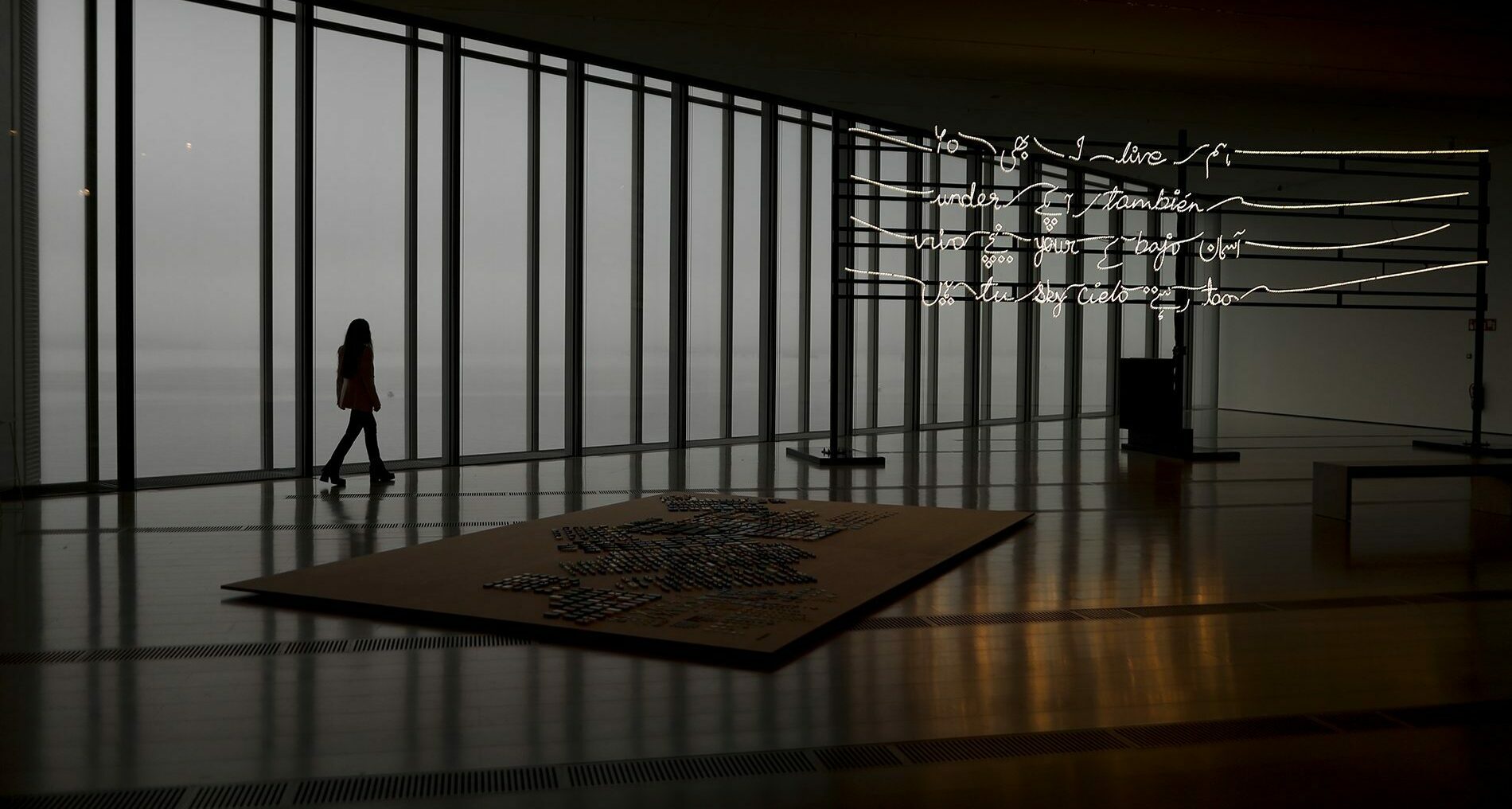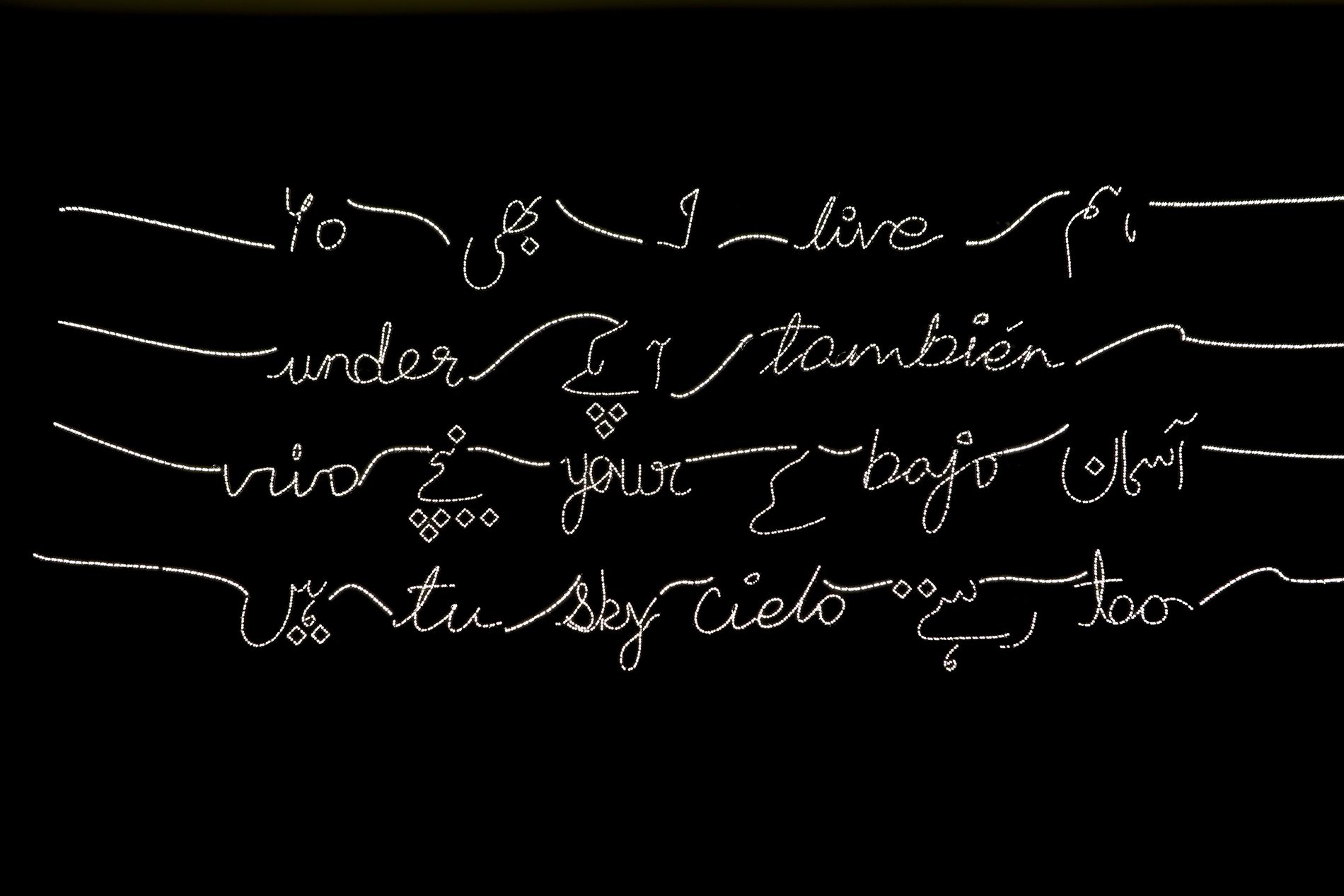 Yo también vivo bajo tu cielo reivindica la existencia de personas reales que han sido silenciadas, aisladas o relegadas a los márgenes. Por ello la artista trabaja con la palabra escrita, cantada o hablada como lugar para la resistencia, visibilidad y empatía, tal y como encarna la instalación de luces LED con la frase que da título a la muestra, escrita en inglés, español y urdu, que no es más que una clara afirmación de su presencia. Una selección de dibujos esbozan cuerpos ausentes de poetas encarcelados, al tiempo que varias esculturas hablan de experiencias de confinamiento corporal y de la persistencia del amor en el aislamiento.