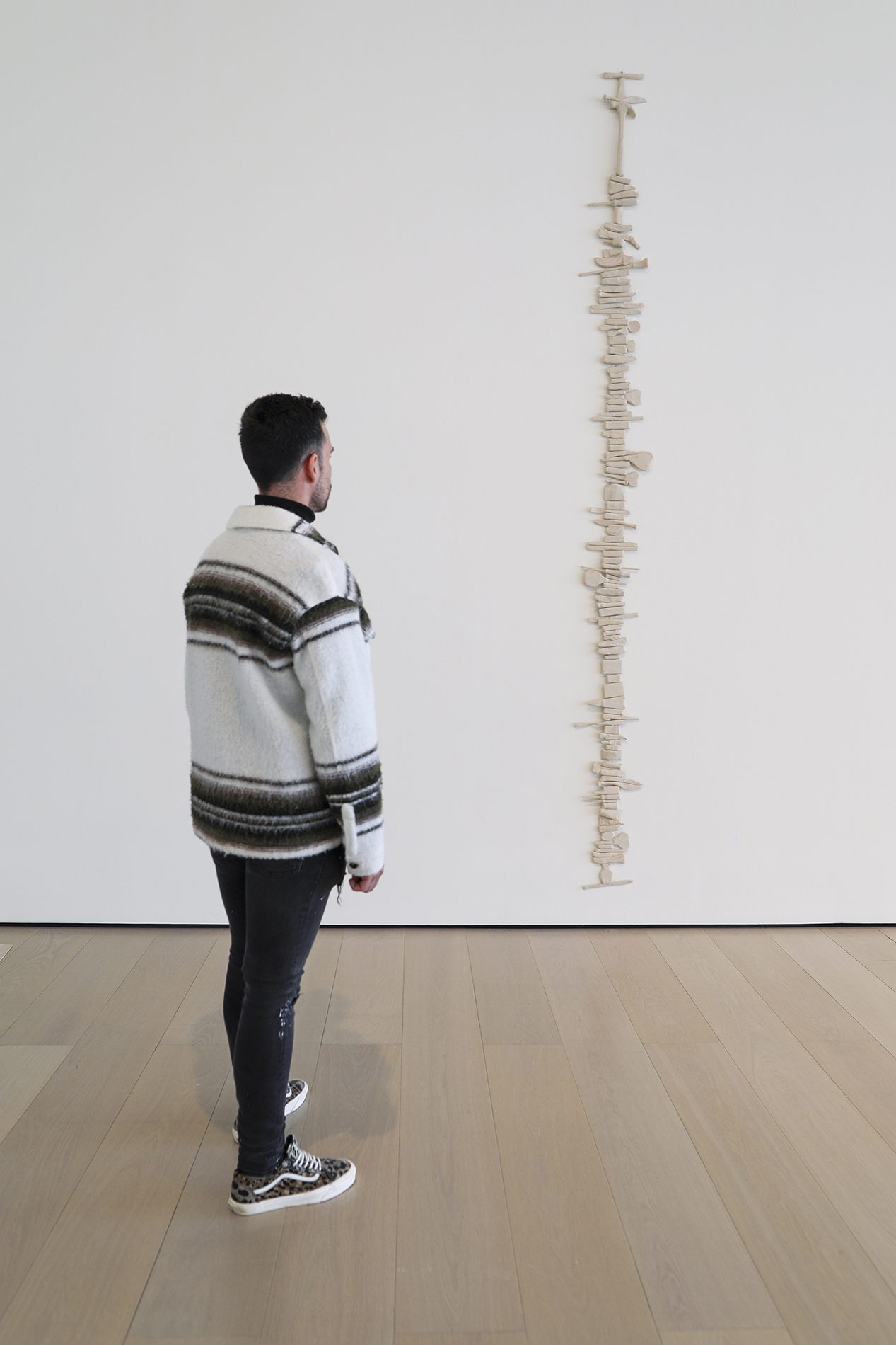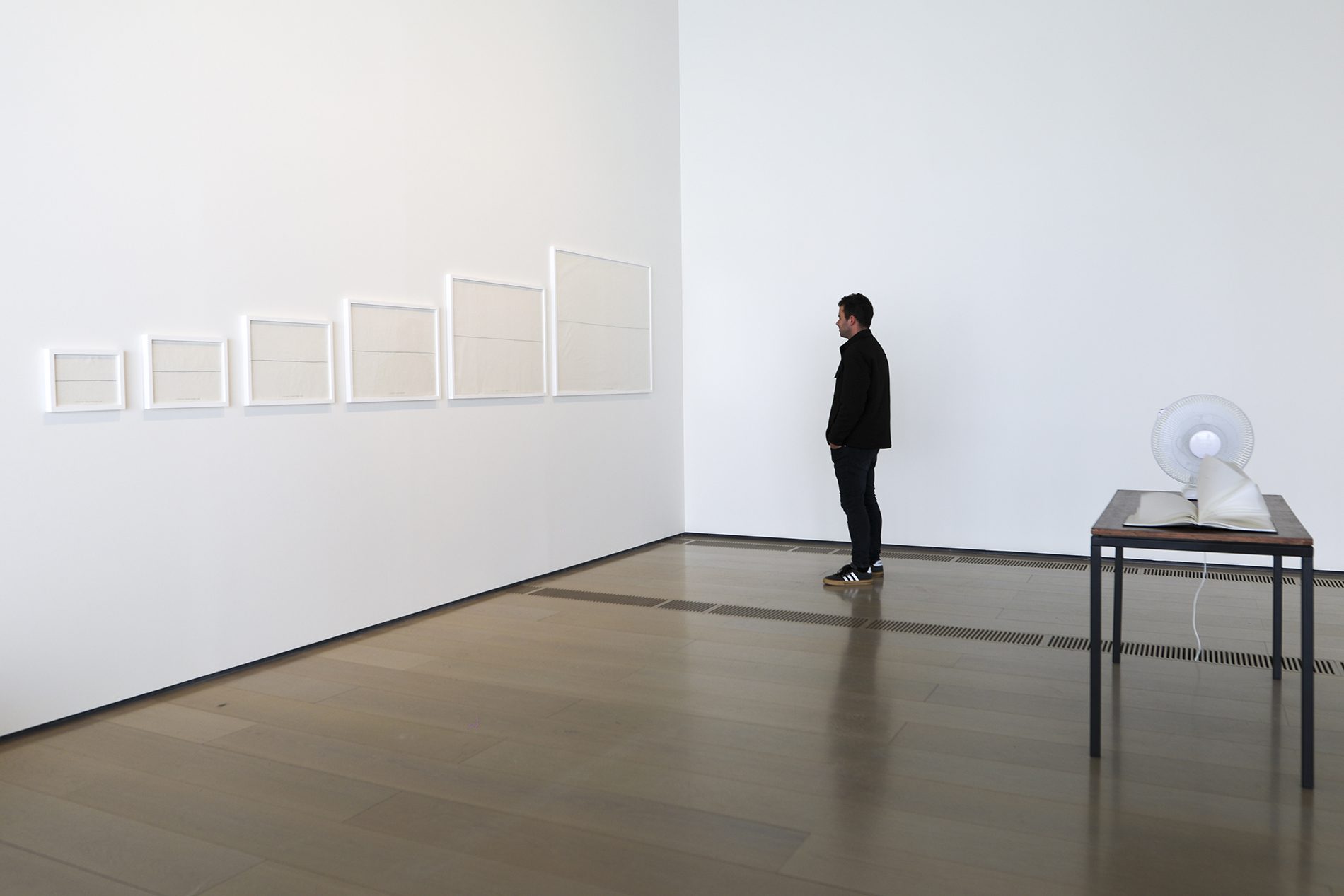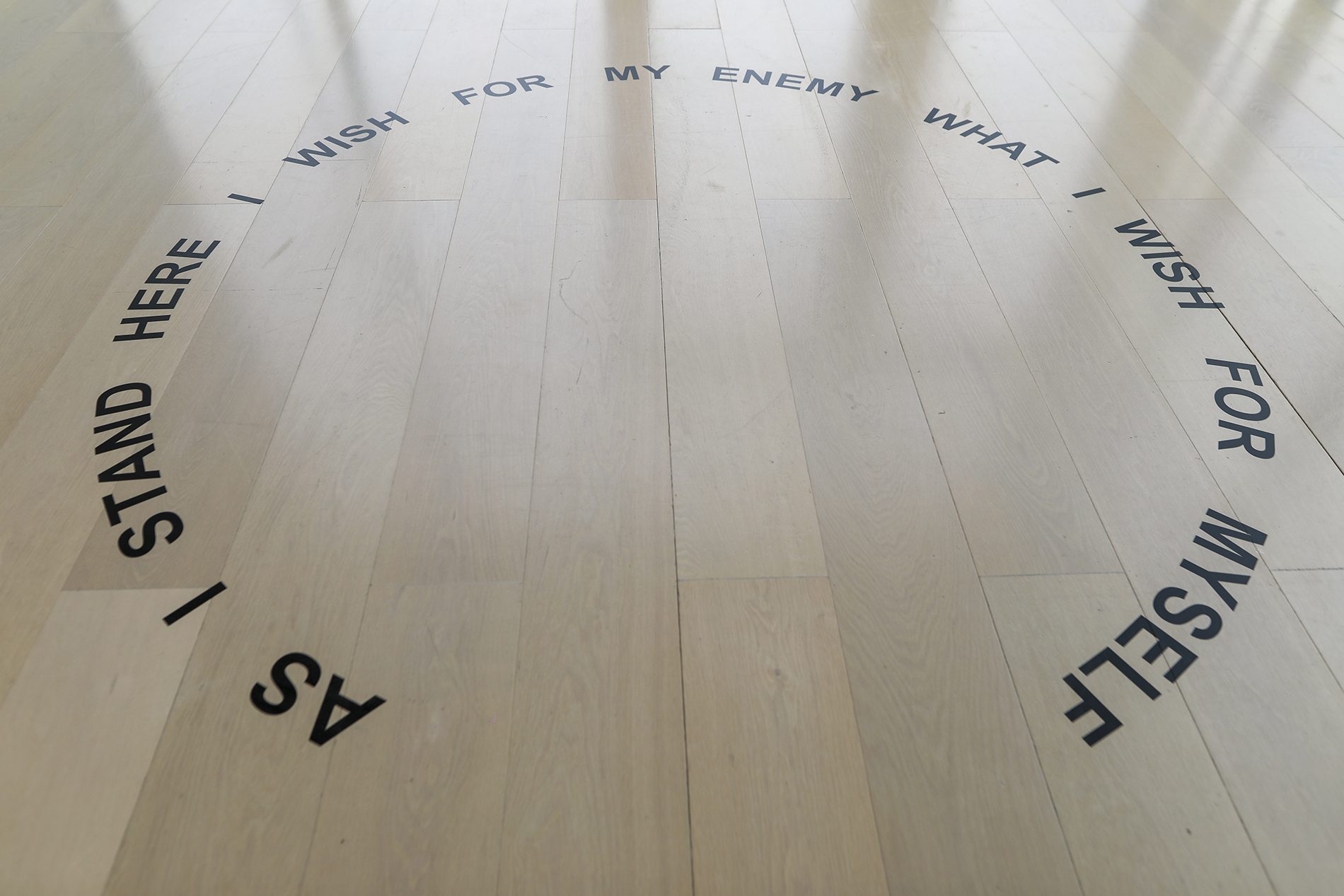 Yo también vivo bajo tu cielo reivindica la existencia de personas reales que han sido silenciadas, aisladas o relegadas a los márgenes. Por ello la artista trabaja con la palabra escrita, cantada o hablada como lugar para la resistencia, visibilidad y empatía, tal y como encarna la instalación de luces LED con la frase que da título a la muestra, escrita en inglés, español y urdu, que no es más que una clara afirmación de su presencia. Una selección de dibujos esbozan cuerpos ausentes de poetas encarcelados, al tiempo que varias esculturas hablan de experiencias de confinamiento corporal y de la persistencia del amor en el aislamiento.