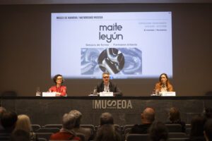 De izquierda a derecha, la directora del Museo, Mercedes Jover; el director general de Cultura, Ignacio Apezteguía; y la creadora, Maite Leyún.