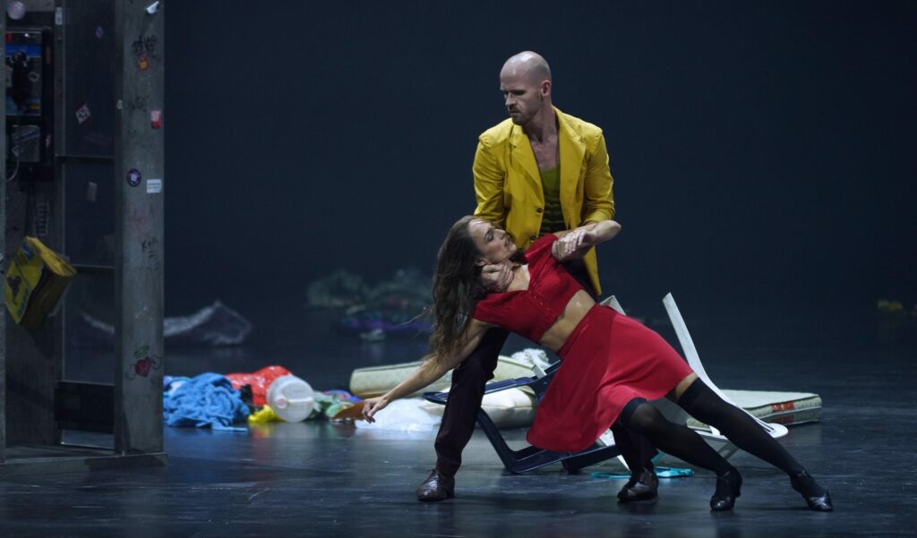 «EL MANDARÍN MARAVILLOSO». Nicky van Cleef (Primer vagabundo), Carla Pérez Mora (La chica). © Javier del Real | Teatro Real.