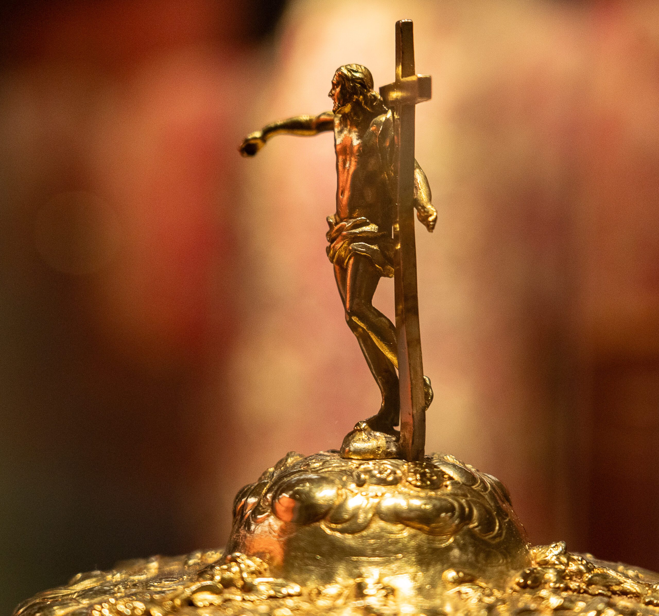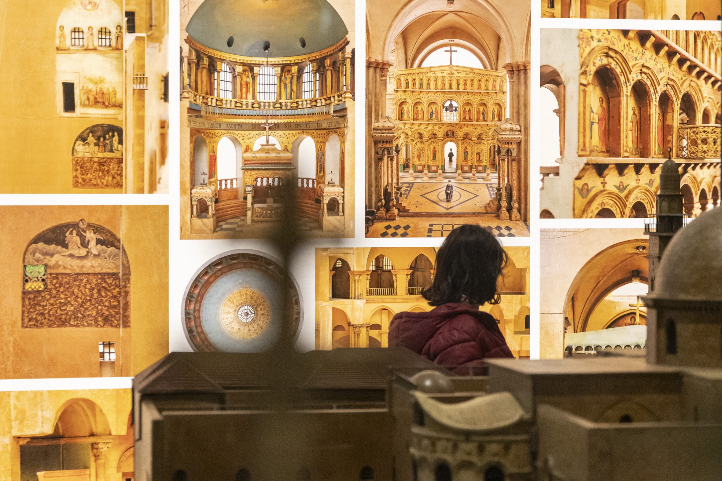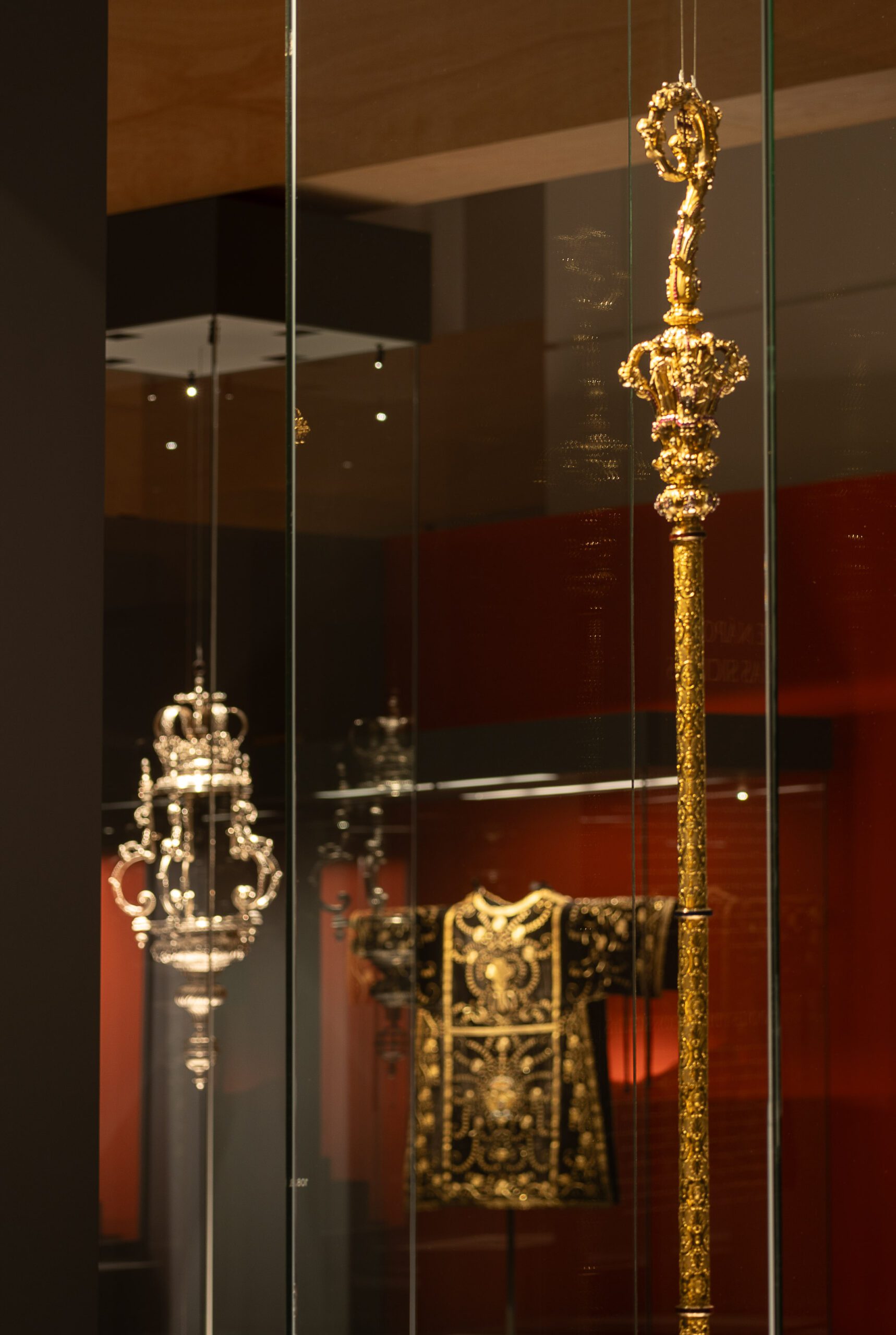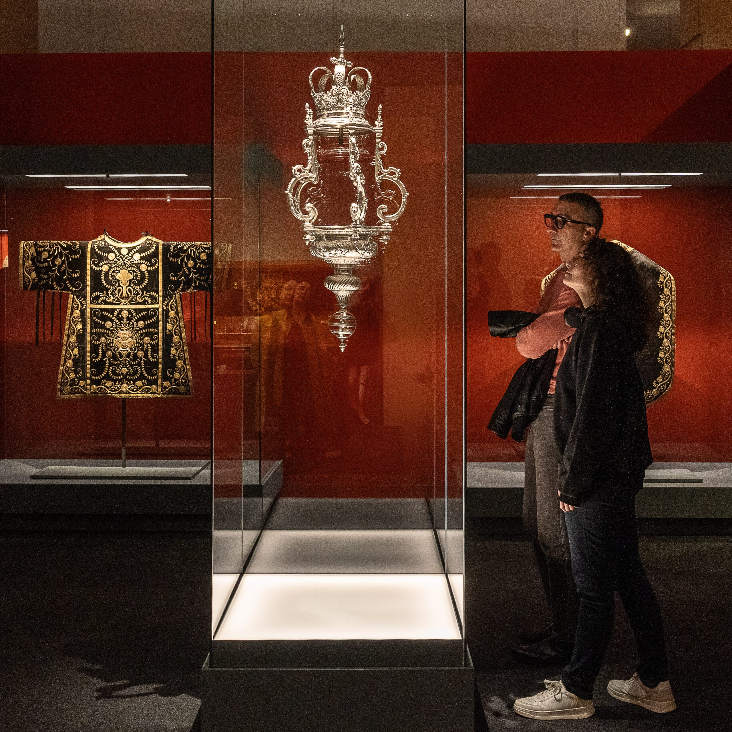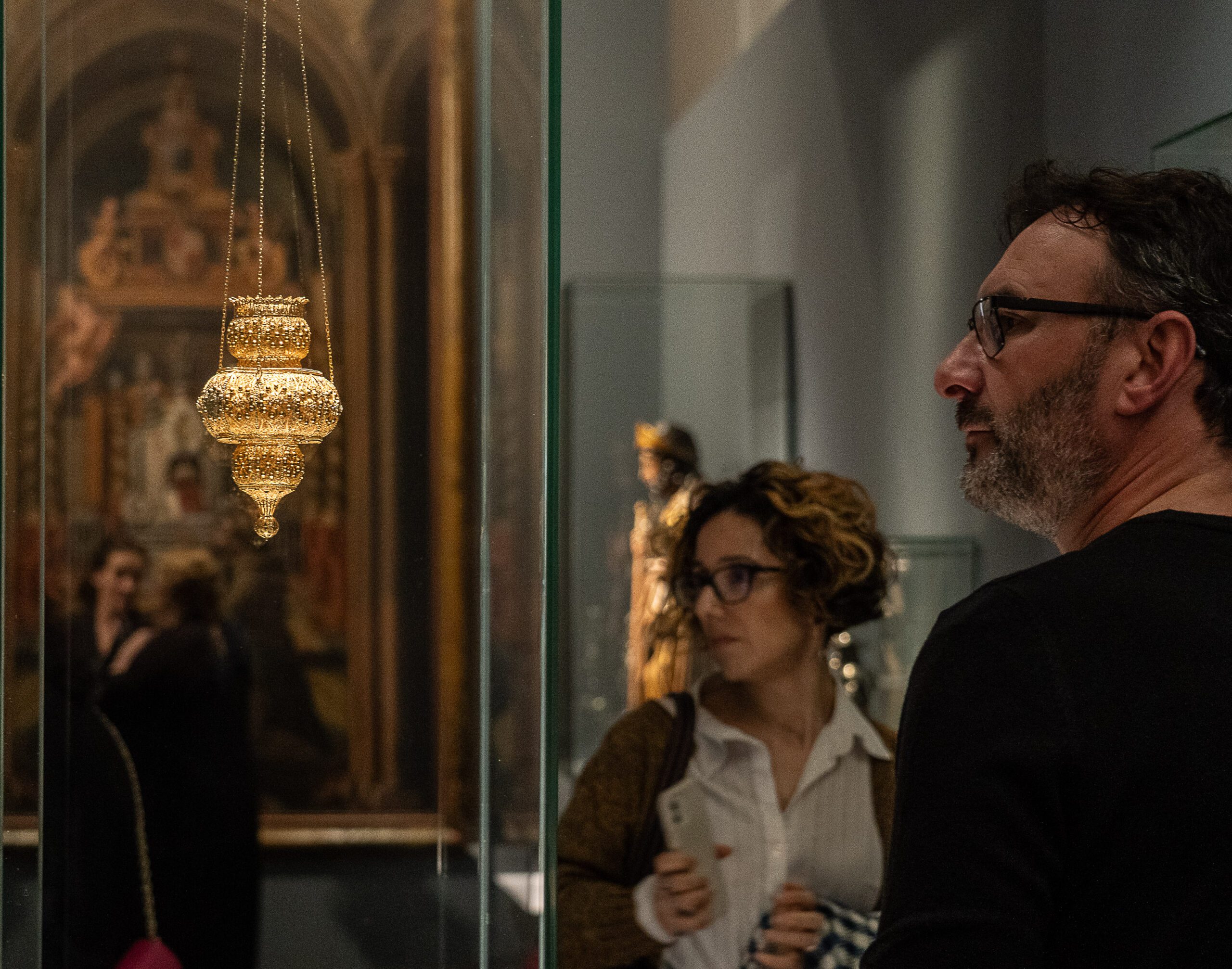 Teniendo como eje central estas donaciones, se exponen un centenar de obras de arte sacro, 75 de ellas pertenecientes al Terra Sancta Museum, en un recorrido expositivo que viaja paralelo al de la historia de las monarquías de España, Portugal, Francia, el Sacro Imperio Romano-Germánico y Nápoles, que hicieron llegar a Jerusalén excepcionales conjuntos artísticos para ser utilizados en el culto y en la ornamentación de la Basílica del Santo Sepulcro y en otros lugares sagrados de este territorio. Así, la muestra sumerge al visitante en el devenir de la propia Jerusalén —la ciudad de mayor simbolismo espiritual para las tres grandes religiones monoteístas— y de su conexión con Santiago, como dos de los grandes centros de peregrinación cristiana del mundo.