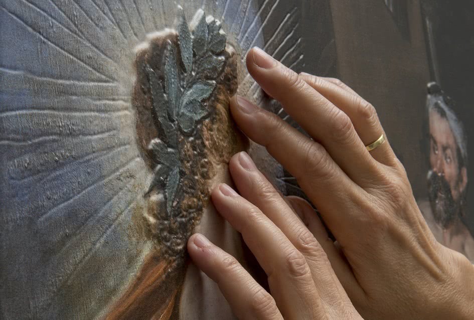 La pintura religiosa, la mitología, la escena costumbrista, el retrato y la naturaleza muerta son los géneros que se acercan por primera vez en el Prado a personas ciegas o con resto de visión a través de la reproducción en relieve de obras como Noli me tangere, de Correggio; La fragua de Vulcano, de Velázquez; El quitasol, de Goya, La Gioconda, del Taller de Leonardo da Vinci; El caballero de la mano en el pecho, de El Greco; y Bodegón con alcachofas, flores y recipientes de vidrio, de Van der Hamen, estas tres últimas reproducidas a tamaño real.
