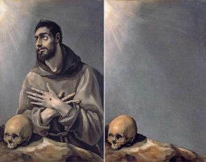 «San Francisco en éxtasis» de El Greco (izq). 1577 – 1580. Óleo sobre lienzo. Museo Lázaro Galdiano «Vánitas» de José Manuel Ballester (der). 2015 – 2016. Impresión Digital sobre tela | Digital Print on Canvas. 89 X 57 cm. | 35,04 X 22,44 inch.