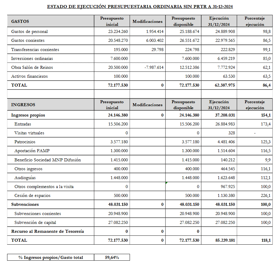 Otros capítulos destacados son los ingresos por patrocinio (6 millones) y audioguías (1,6 millones), entre otros. El nivel de autofinanciación, entendido como la relación entre los ingresos propios y los gastos totales, fue cercano al 60% (59,64%, y un 58,65% si se contabilizaran los fondos PRTR).