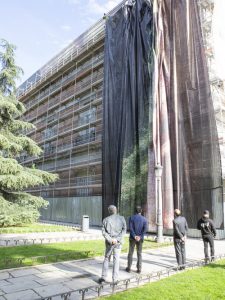 Imagen del proceso de instalación de una de las lonas de la fachada de Velázquez. Foto © Museo Nacional del Prado.