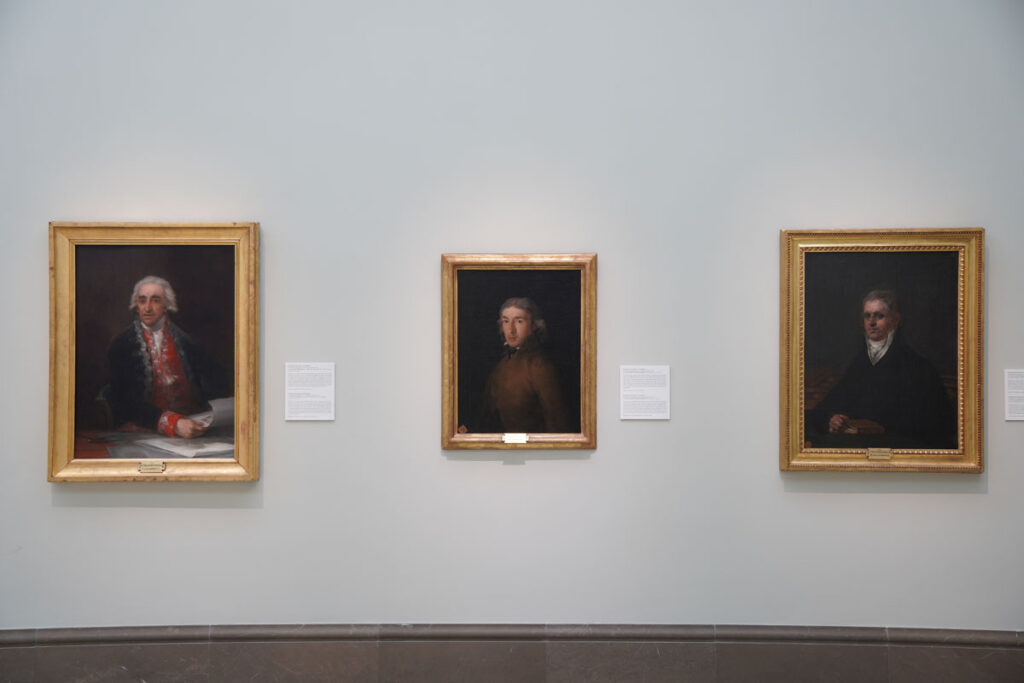 Con esta reorganización, la primera sala contextualiza a Goya en el Madrid contemporáneo a través de la Vista de la calle de Alcalá de Antonio Joli. El contenido de esta sala se articula en torno a los encargos recibidos por el pintor desde diversos estamentos, dando lugar a retratos oficiales con una gran carga simbólica, como los de Godoy, Fernando VII a caballo o «La Tirana». Las pinturas se acompañan por una galería de esculturas de personajes retratados por el aragonés: como los actores Rita Luna e Isidoro Máiquez, el escultor Esteban de Ágreda o Carlos IV.