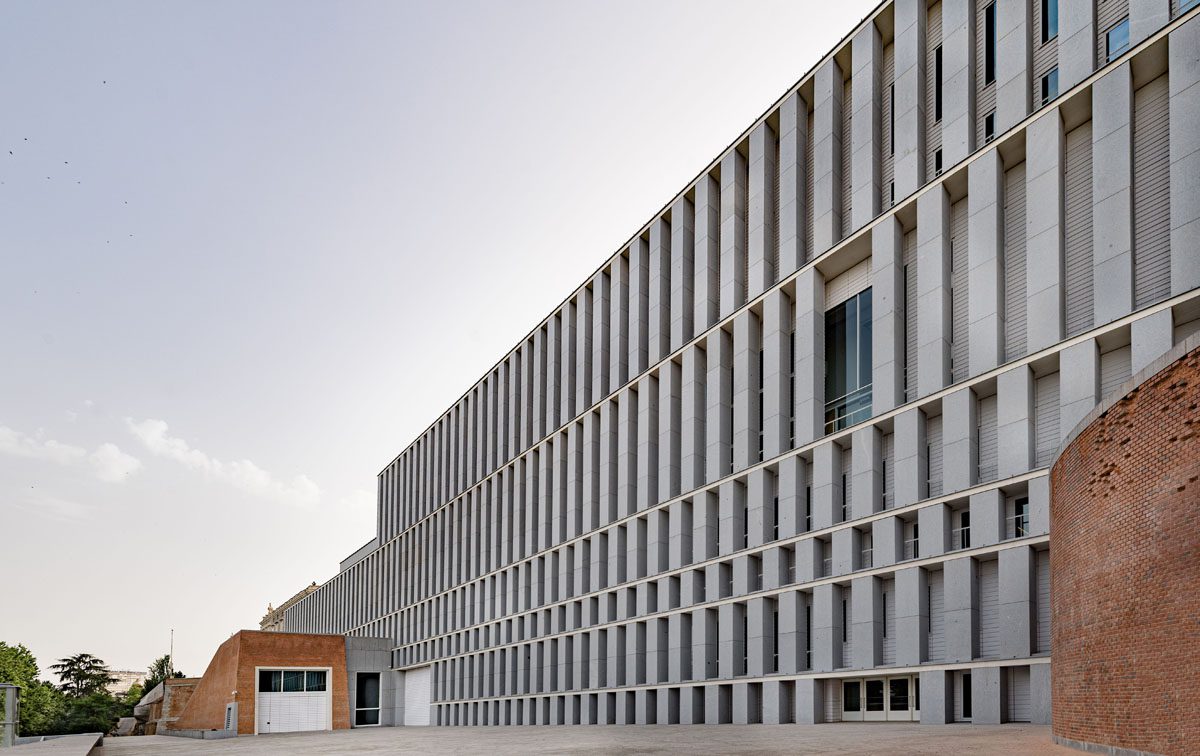 Es una obra plenamente contemporánea, sobria y sencilla, pero al mismo tiempo supone todo un alarde arquitectónico: sujeta la cornisa de Madrid con un inmenso muro pantalla. Su fachada se configura a base de pilares de hormigón armado recubiertos por placas de granito en la cara exterior. El interior sorprende por la amplitud de espacios, la luz natural y las vistas.