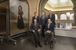 De izda. a dcha. y de arriba abajo: Rafael Pardo, director de Fundación BBVA; Mitchell A. Codding, director de Hispanic Society; Miguel Zugaza, director del Museo del Prado; José Pedro Pérez-Llorca, presidente del Real Patronato del Museo del Prado; y Philippe de Montebello, presidente de la Hispanic Society, junto a la obra 'La Duquesa de Alba' de Goya.
