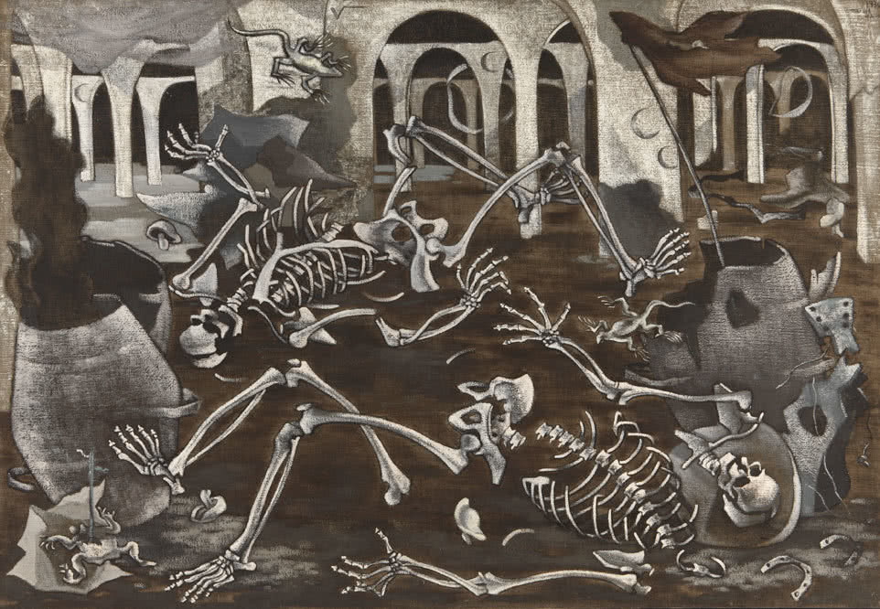 Otra novedad importante es el cuadro Antro de fósiles (1930), de Maruja Mallo, que pertenece a la serie Cloacas y campanarios, y ha sido adquirida por Cultura para el Museo Reina Sofía. Es una composición donde dominan los colores sombríos y un contenido que adelanta el drama bélico que iba a vivir no sólo España sino también el resto de Europa. También se exhiben del pintor cordobés Antonio Rodríguez Luna (1910-1985) cuatro dibujos que estuvieron colgados en el Pabellón Español del 37.