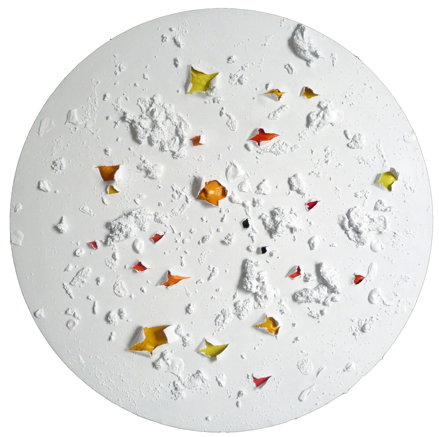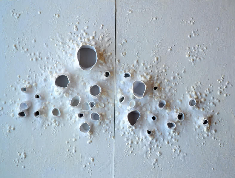 Una amiga me decía que estos boquetes eran como las sajaduras que ahora prescribe la moda en los pantalones vaqueros, llenos de agujeros. Y que si por ellos emerge la carne, por las sajaduras a modo de cráteres que abre Cova Rios en sus blancos cuadros emerge el alma. La comparación me pareció tan acertada como pedagógica.