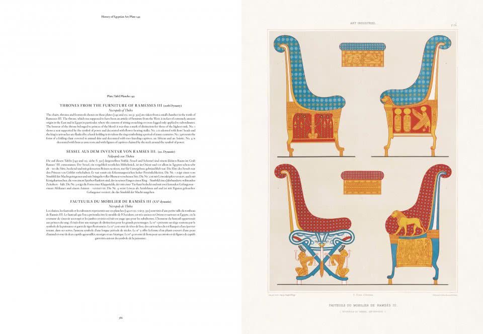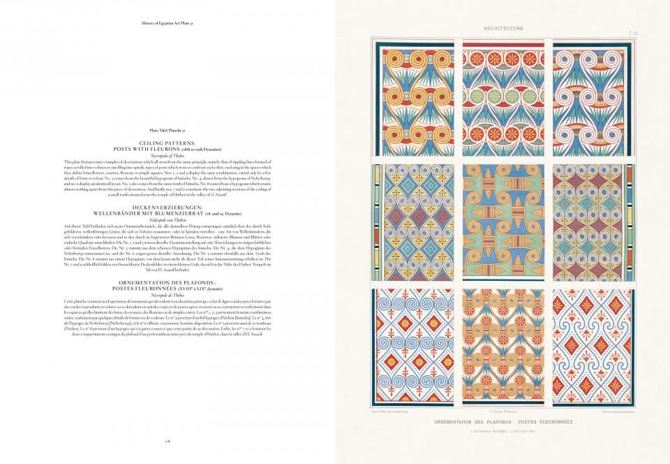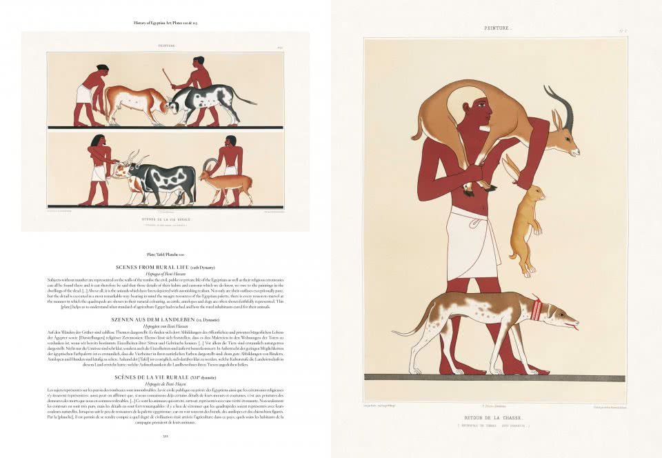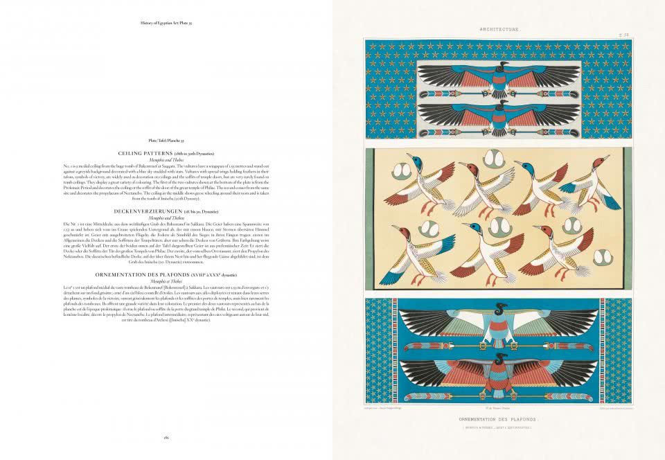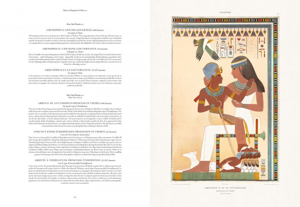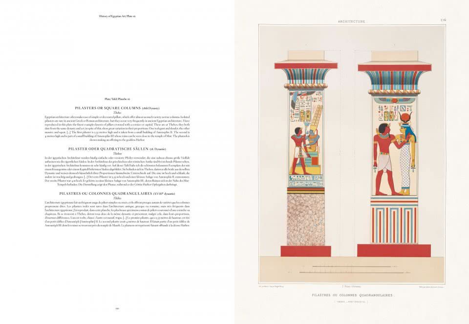 Tras visitar de nuevo el norte de África, en 1860 regresó a París con el fruto de sus numerosos viajes: centenares de dibujos, fotografías, bocetos, planos y 400 metros de bajorrelieves. Fascinado por la simetría, la complejidad y la suntuosidad del arte egipcio y árabe, Prisse d’Avennes se inspiró en su vasta colección para crear compilaciones de arte y arquitectura, basadas en el estudio de documentos originales y su contexto histórico, social y religioso. Su bellísimo álbum de arte egipcio se publicó íntegramente en París en 1878 con el título Histoire de l’art égyptien y contenía 159 láminas extraordinarias. En esta edición plurilingüe de Taschen se reproduce por primera vez la colección completa que conforman estas magníficas ilustraciones sobre arquitectura, escultura, pintura y arte industrial.