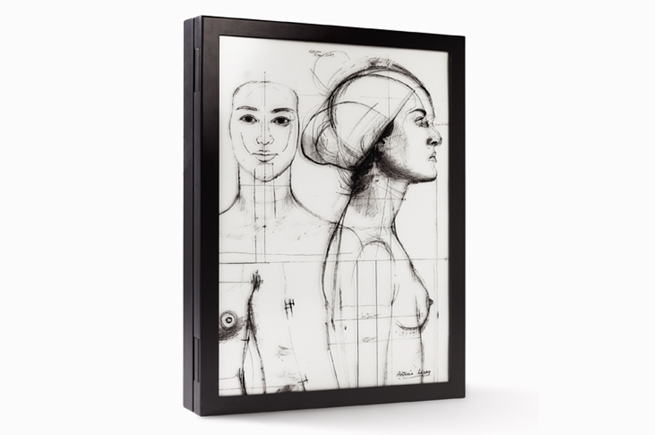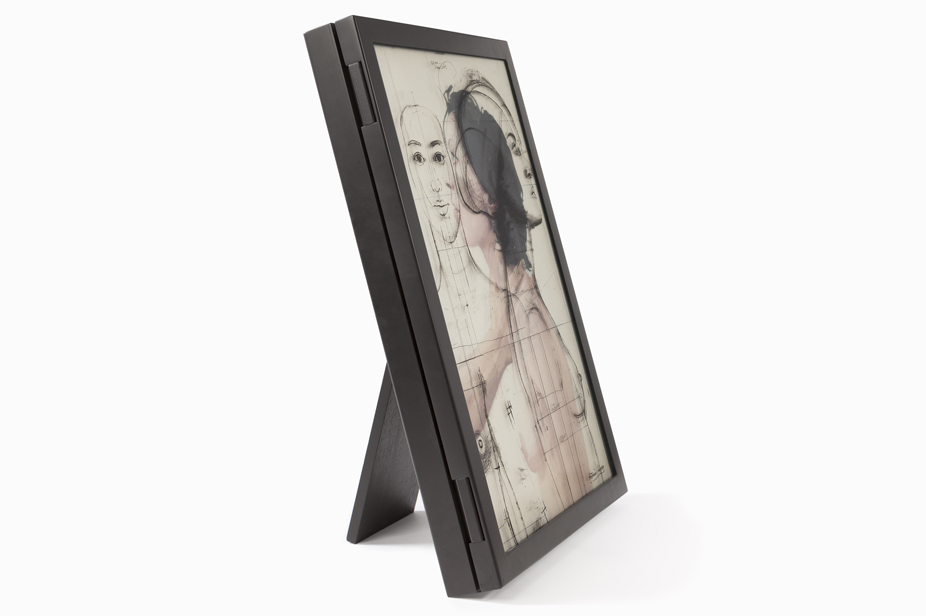El estuche, realizado artesanalmente en madera de arce, cuenta con una cubierta de vidrio transparente en la que está grabado mediante serigrafía manual un boceto de la escultura La mujer de Coslada. Esto ofrece múltiples posibilidades a la hora de exponer la obra, ya que permite jugar mediante la superposición del dibujo con el elemento que se decida colocar dentro, ya sea la portada, la contraportada o una lámina en blanco.