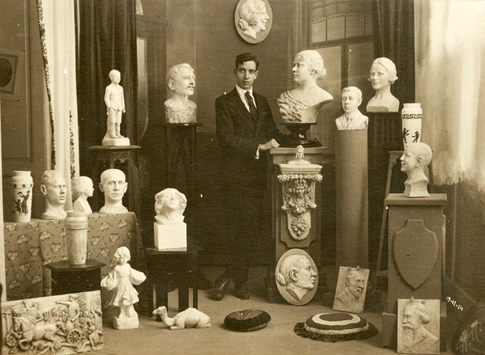 Pancho Lasso con sus esculturas en 1924. Autor: Aquiles Heitz Augier. Archivo de Alberto Lasso Clavijo.