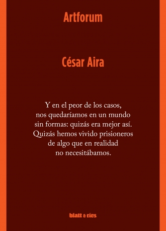 El arte y los artistas han sido más de una vez combustible inspirador para Aira. Artforum, la sofisticada revista sobre arte contemporáneo fundada en Nueva York hace casi sesenta años, se convirtió para el narrador y cabe presumir que que también para el propio Aira en una fuente de obsesiones, manías y supersticiones, la mayoría de ellas ligadas a la dificultad de encontrarla en Argentina, la desazón de los retrasos tras la suscripción o a la búsqueda de números antiguos de un artefacto que era mucho más que papel y tinta, era “también ideas y ensueños; reproducían la dialéctica del arte, con tanta o más propiedad que el arte mismo”.