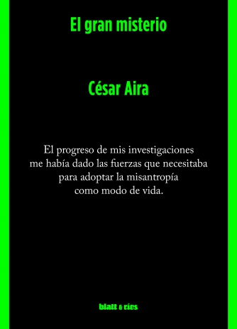 Aún más breve es El gran misterio. En este caso el narrador es una suerte de científico amateur que se autocalifica de Genio y nos relata una mínima trama descacharrante con pocos personajes de escasa entidad (la esposa temerosa de ser asesinada, los abogados que llevan el divorcio…) pero que merece la pena seguir para encontrar humoradas como la siguiente: “Si bien no soy de naturaleza sociable, y mis estudios y trabajos me han mantenido relativamente aislado del común de la gente, he tenido el trato suficiente con los seres de mi especie para apreciar sus abismales limitaciones mentales. De mil hombres, uno solo puede articular algo inteligente una vez al año. No es que yo sea un misántropo: soy realista”. Es lo que tiene el universo de César Aira: que si valoras esa voz propia, ese sello tan personal que tiene todo lo que sale de su imaginación, disfrutarás más con unas historias que con otras pero cuando te descuides habrás empezado una colección.