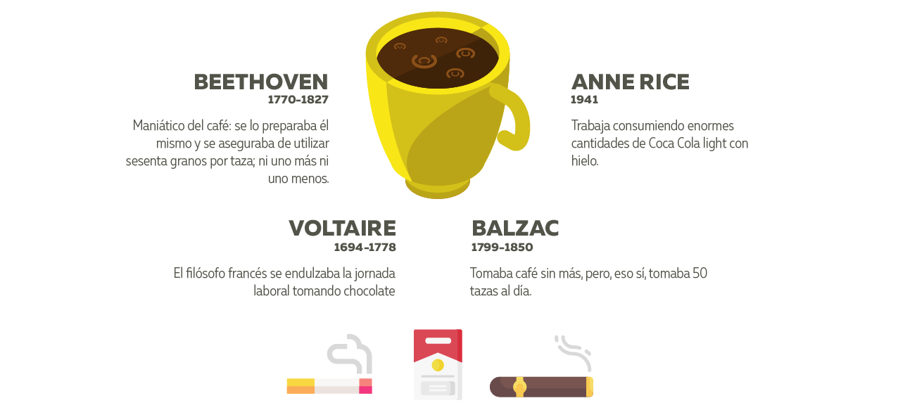 Entre los maniáticos del café, lugar de honor para Balzac y sus cincuenta tazas diarias y también para Beethoven (1770-1827) que se lo preparaba el genial compositor para asegurarse de utilizar sesenta granos por taza, ni uno más ni uno menos. El chocolate era el combustible filosófico de Voltaire (1694-1778) y la Coca Cola Light el de Anne –Entrevista con el vampiro– Rice. En el capítulo del tabaco, la palma se la lleva Franz Liszt (1811-1886). El creador de las Rapsodias húngaras solo se quitaba el cigarro de la boca para comer y dormir.