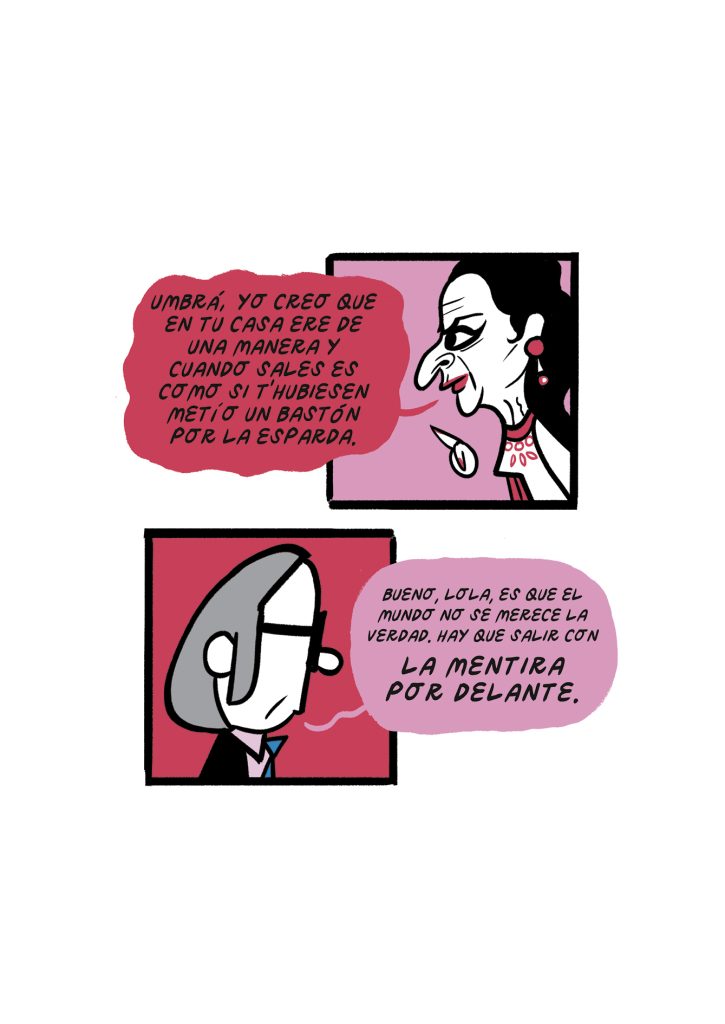 Aunque lo que Umbral dice, piensa o le dicen en este cómic procede de una veintena de sus libros, de algunos artículos y de media docena de intervenciones televisivas, huelga decir que no es esta la obra para llegar al verdadero Umbral porque ya se encargó él, contándose en miles de páginas, de que nadie pudiera acceder a su verdad más íntima. Quizá por eso sobrecoge tanto ese momento en que, en el documental Anatomía de un dandy (2020), de Alberto Ortega y Charlie Arnaiz, le escuchamos hablando a su hijo, por fin sin máscara alguna.