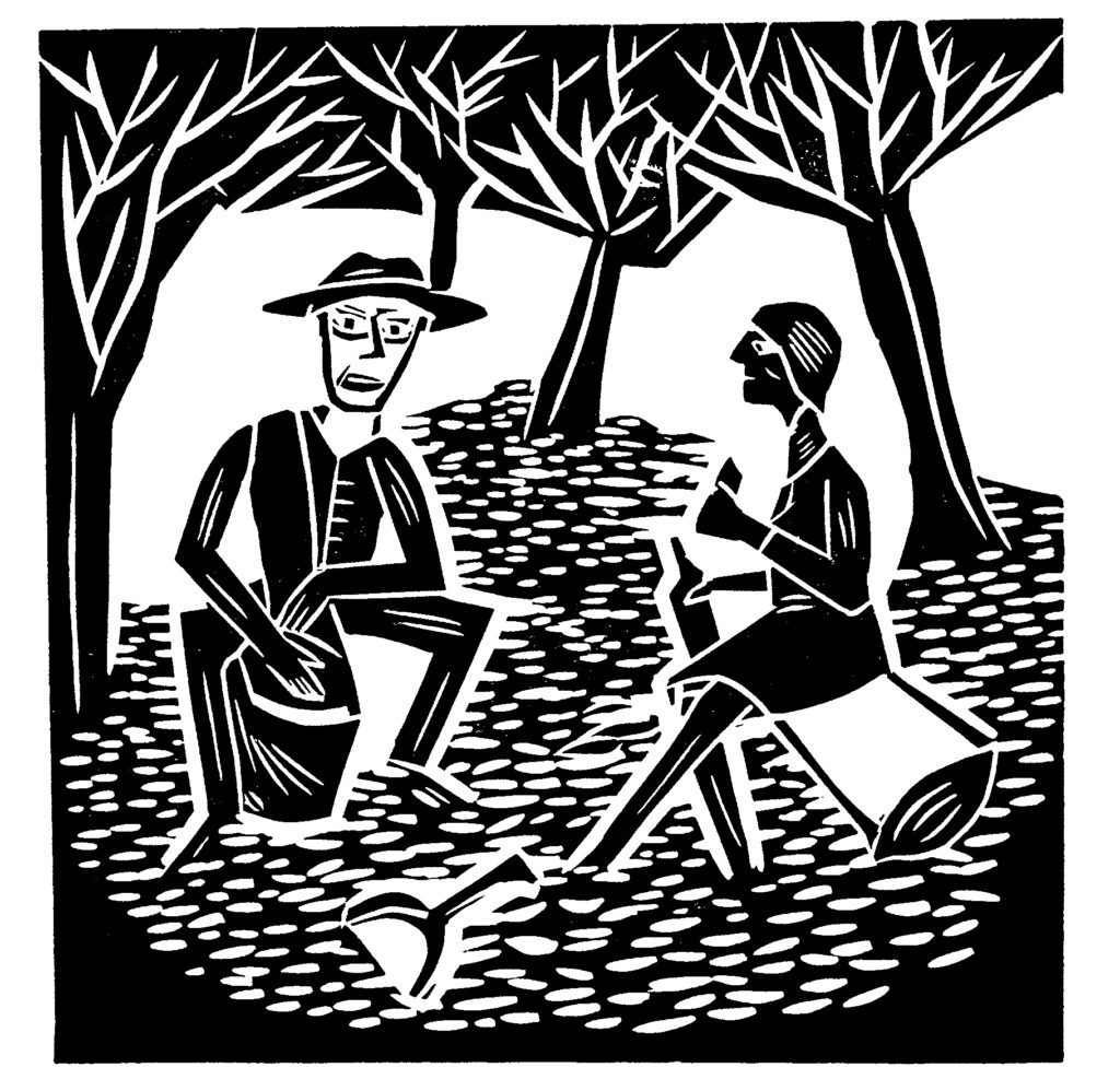 O cuando hace una tipología del coño buscando el efecto sinestésico (“el coño es una montaña / blanca de azúcar”) pero también con afanes puramente descriptivos, poéticos (“el coño es una telaraña / un embudo de seda / el corazón de las flores”) y, cómo no, humorísticos (“hay coños que bostezan / y no dicen una palabra / así los mates”). La estampa evocadora, el personaje peculiar, el humor y el realismo mágico están en los linograbados de Baonza. El grabador y escultor madrileño también ilustra los textos más narrativos de El viaje, que es la luna de miel aplazada de dos ancianos con un objetivo antes de morirse: conocer el mar siguiendo el sendero del río, y El libro de las iglesias, un paseo con mucha presencia de la muerte y una enorme variedad de animales alados por lugares a veces en ruinas que un día fueron espacios sagrados.
