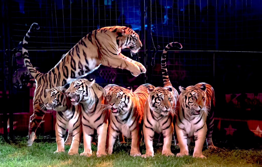 El domador de tigres se presentó haciendo una elegante venia, sin importarle las seis fieras rugiendo a su espalda. El público aplaudió el primer acto de valentía del domador de tigres, que, de inmediato, hizo correr a los animales rodeando la valla metálica. El siguiente acto fue hacer que los animales saltaran a taburetes ubicados en forma de círculo y se quedaran quietos haciendo equilibrio con sus patas en ese reducido espacio.