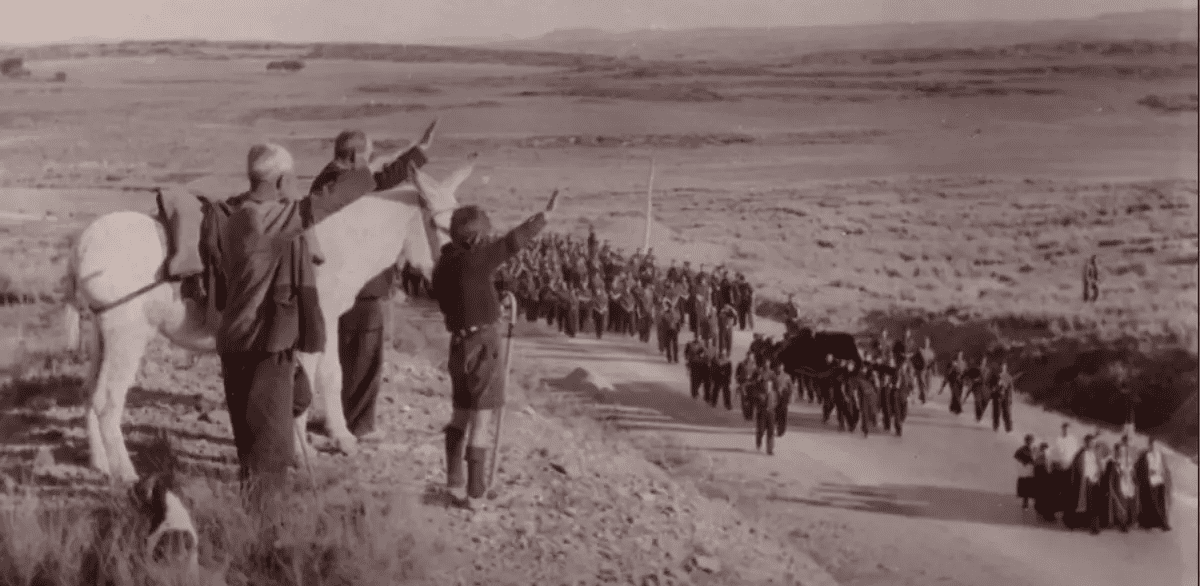 1939. La guerra ha terminado. España está en ruinas. En el cementerio de Alicante exhuman los restos de José Antonio. Sus camaradas van a llevarlo a hombros hasta enterrarlo en el monasterio de San Lorenzo de El Escorial, morada de reyes, sepulcro imperial. Durante 11 días y 10 noches, el cortejo fantasmagórico avanzará por pueblos y ciudades entre hogueras, escarcha, brazos enhiestos y propaganda: una epopeya fascista de 467 kilómetros para demostrar quién manda en la nueva España.