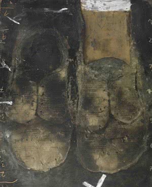 Pintados sobre tabla, los contornos de cada enorme zapato están tallados con una exuberante marmolina oscura, óleo y látex. Sobre el pie derecho hay una cruz blanca, un recurrente icono en la obra de Tàpies que enfatiza la presencia humana; es símbolo de la fe cristiana, pero también lo es de la muerte, señal del lugar donde descansarán los caídos en conflicto.