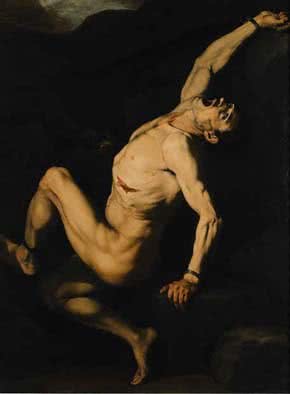De tema mitológico, esta obra de gran tamaño realizada por Ribera (mide 193,5 por 155,5 centímetros), representa a Prometeo, el titán que se atrajo las iras de Júpiter al robar el fuego para dárselo a los hombres. Este cuadro constituye una de las piezas más dramáticas y violentas realizadas por El Españoleto. En el óleo, el titán amigo de los mortales, aparece de perfil, completamente desnudo, encadenado a una roca, gritando de dolor, y con una gran herida en el costado causada por los picotazos del águila que bajaba diariamente a comerle el hígado.