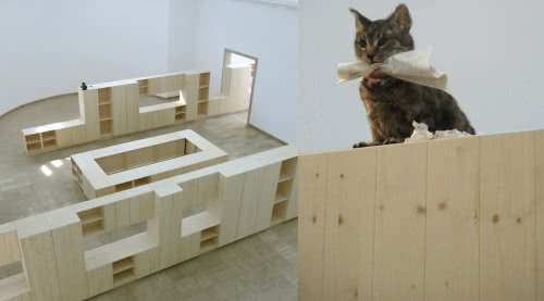 Dentro de la instalación, un gato disecado, sentado sobre uno de los módulos, habla al observador de encuentros, relaciones, utopía y melancolía, sueños y desilusiones, el paso del tiempo y la transformación, llenando de sonido el espacio expositivo y la mente del espectador.