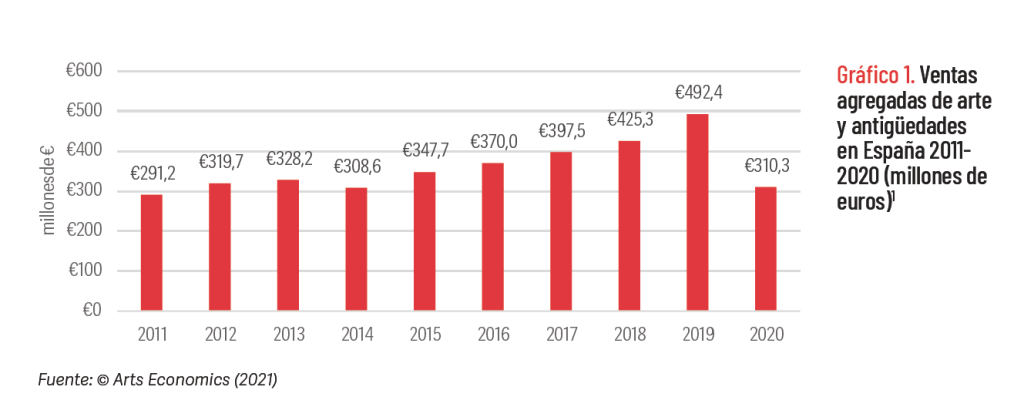 El sector de las subastas en España es considerablemente más pequeño que el de las galerías, y se estima que las ventas representaron alrededor del 24% del mercado total del arte en términos de valor en 2020, incluidas las estimaciones para ventas públicas y privadas.