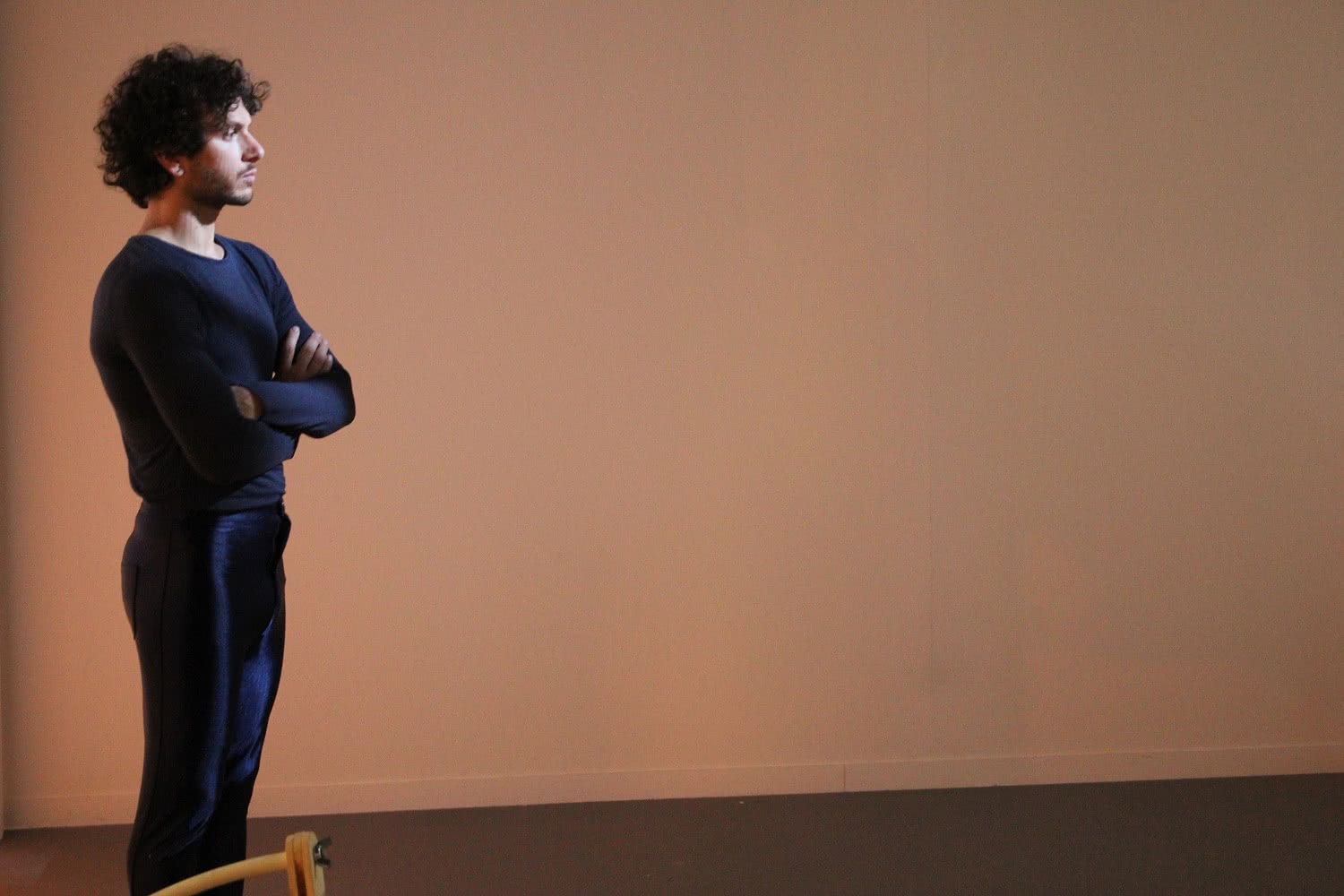 performer Lucio Baglivo interactuando con la instalación Movimiento armónico, de Leonor Serrano Rivas. ARCOmadrid 2016. Foto: Luis Martín.' data-link='' class='shiba-stage' />