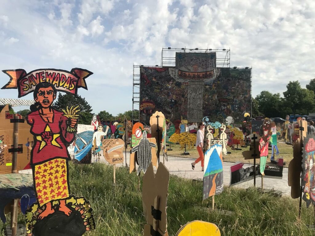 El colectivo de artistas Taring Padi [2] ha tenido que retirar su pieza People’s Justice (2002) acusada de contener una “caricatura antisemita de una persona judía”, así como referencias despectivas al Mossad, la agencia nacional de inteligencia israelí. La obra es una pancarta de aproximadamente 18 metros que estaba colocada en una posición destacada en la Friedrichsplatz. Tras ser eliminada por completo de la exposición, un equipo de consultores independientes está reexaminando su contenido.