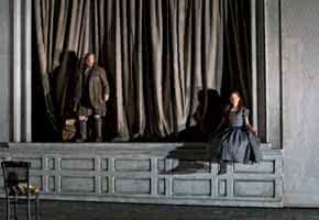 La producción de David Alden nos presenta paredes desconchadas y ventanas por las que salen y entran los protagonistas, con una Lucia tipo muñeca con temor de su hermano que parece abusar sexualmente de ella. Edgardo viste de escocés y el coro y resto de intervinientes parecen ambientados en la Inglaterra victoriana. Funciona bien el movimiento escénico excepto para una salida de escena de Edgardo que realiza por la ventana tipo Cherubino en Le nozze di Figaro y que aquí, si me permiten, no viene a cuento.
