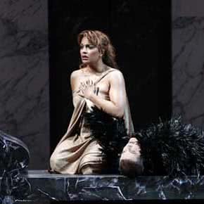 Pier Luigi Pizzi es el escenógrafo y nos presenta un decorado central giratorio de corte neoclásico en dos de sus dos caras, y una tercera mostrando la casa de Séneca, combinado con un movimiento escénico apropiado para los cantantes y siempre sugerente de lo que está sucediendo.