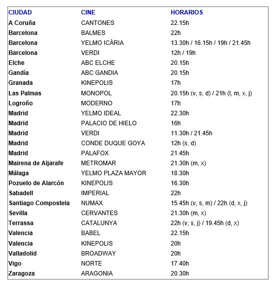 Cines que proyectan The Beatles: Eight days a week hasta el 29 de septiembre y sus correspondientes sesiones. © A Contracorriente Films.