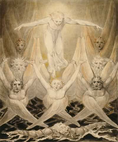 El artista inglés llenó sus obras de figuras, sin seguir la tradición paisajística típica del mundo inglés. Blake insiste en sus dibujos, acuarelas y grabados en un arte emblemático, exento de la narratividad tradicional. Sus connotaciones espaciales derivan de un uso simbólico de los colores y las composiciones, con poco uso de la perspectiva. Sin embargo, dichas simplificaciones se analizan bajo un prisma de compleja temática.