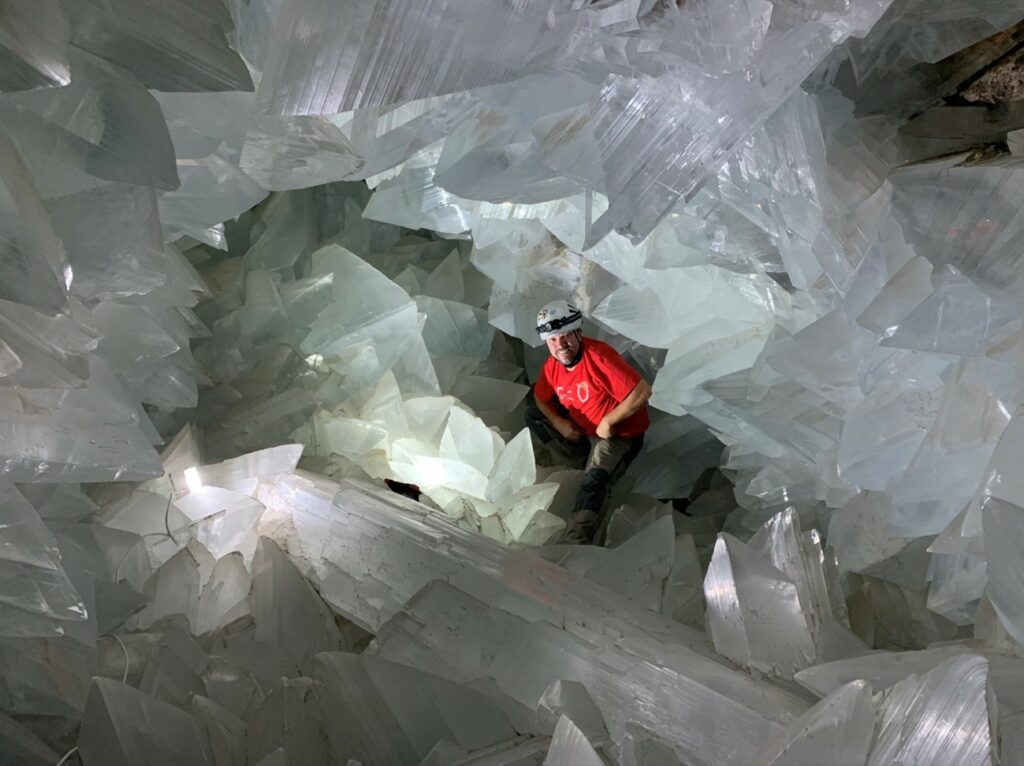 Fotografía: Geoda de Pulpí, en el interior, el geólogo Francisco Javier Fernández del Amo, uno de los principales protagonistas en la rehabilitación de la Mina Rica y la geoda para su visita al público.