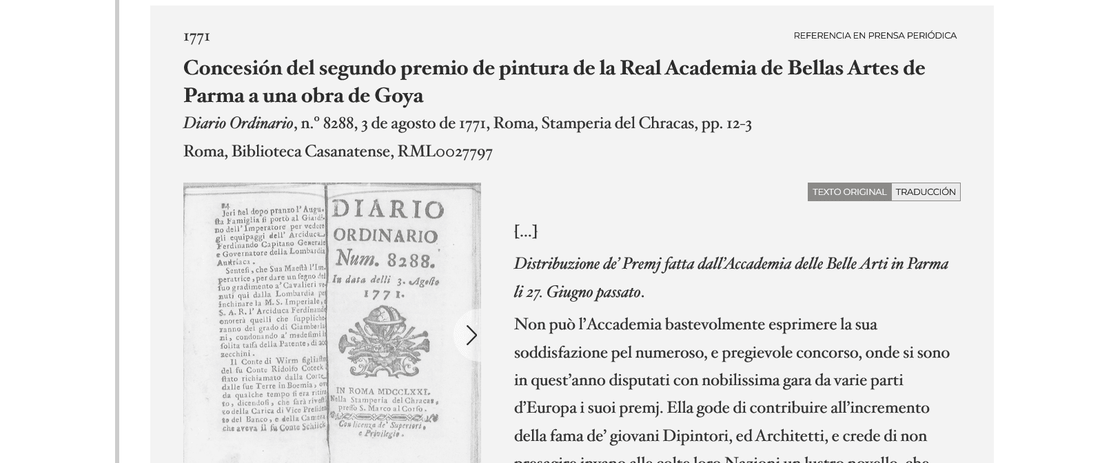 En vida de Goya, su nombre apareció impreso en libros, periódicos y estampas con mucha mayor frecuencia que el de cualquier otro artista español de su tiempo. Desde la primera mención en la Gaceta de Parma en 1771, con motivo de su premio en la Academia, hasta el aviso de su fallecimiento en 1828, su nombre apareció como autor de destacadas obras, tanto pictóricas como grabadas. Libros de actas, libros de historia del arte, artículos periodísticos, anuncios de sus series de estampas y retratos grabados a partir de sus pinturas fueron, entre otros, los medios a través de los cuales se cimentó su fama. En este monográfico se reproducen todas las referencias publicadas con el objetivo de servir de instrumento a investigadores y aficionados. Se encuentran ordenadas cronológicamente, transcritas y enlazadas a los documentos originales.
