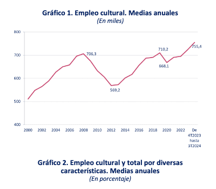 Estos datos confirman la tendencia al alza registrada durante 2023, tal y como refleja el Anuario de Estadísticas Culturales 2024 recién presentado. La estadística oficial del Ministerio, que incluye una selección de los resultados estadísticos más relevantes del ámbito cultural, refleja que el volumen de empleo cultural registró en 2023 un incremento del 4% con respecto a 2022, lo que supone que más de 723.000 personas trabajaron en la industria cultural el pasado año, un 3,4% del empleo total en nuestro país.