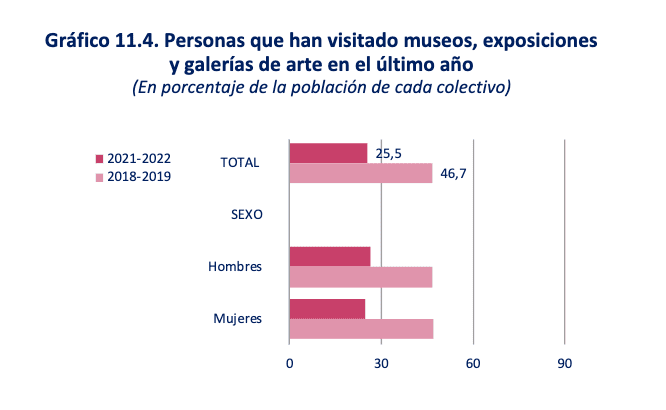 Por otro lado, los espectáculos en directo, la asistencia a monumentos o las visitas a museos, exposiciones y galerías de arte, aunque aún reflejan de forma muy clara el impacto de la crisis de la COVID-19, siguen en tendencia creciente. Por ejemplo, en cuanto a los museos, la estadística estima que las 1.522 instituciones museísticas investigadas recibieron 51,6 millones de visitantes a lo largo de 2022, cifra que, si bien supone un importante incremento respecto a 2020 del 153,5%, no alcanza los niveles prepandemia registrados en 2018. En 2022 el número medio de visitas por museo abierto fue de 35.221 frente a 13.817 en 2020.