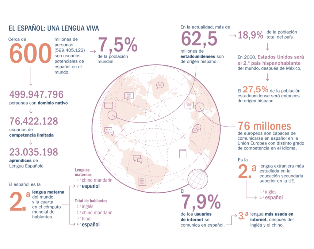 El Anuario se abre con el exhaustivo estudio El español: una lengua viva. Informe 2023, que como cada año ha elaborado David Fernández Vítores. En él destaca el dato de los casi 500 millones de personas (499.947.796) que tienen el español como lengua materna (el pasado año se superaron los 496 millones), lo que supone el 6,2 % de la población mundial). La cifra total de usuarios potenciales roza los 600 millones (599.405.122) si a las personas con dominio nativo se les suman los usuarios de competencia limitada (76.422.128) y los aprendices como segunda lengua o como lengua extranjera (23.035.198).